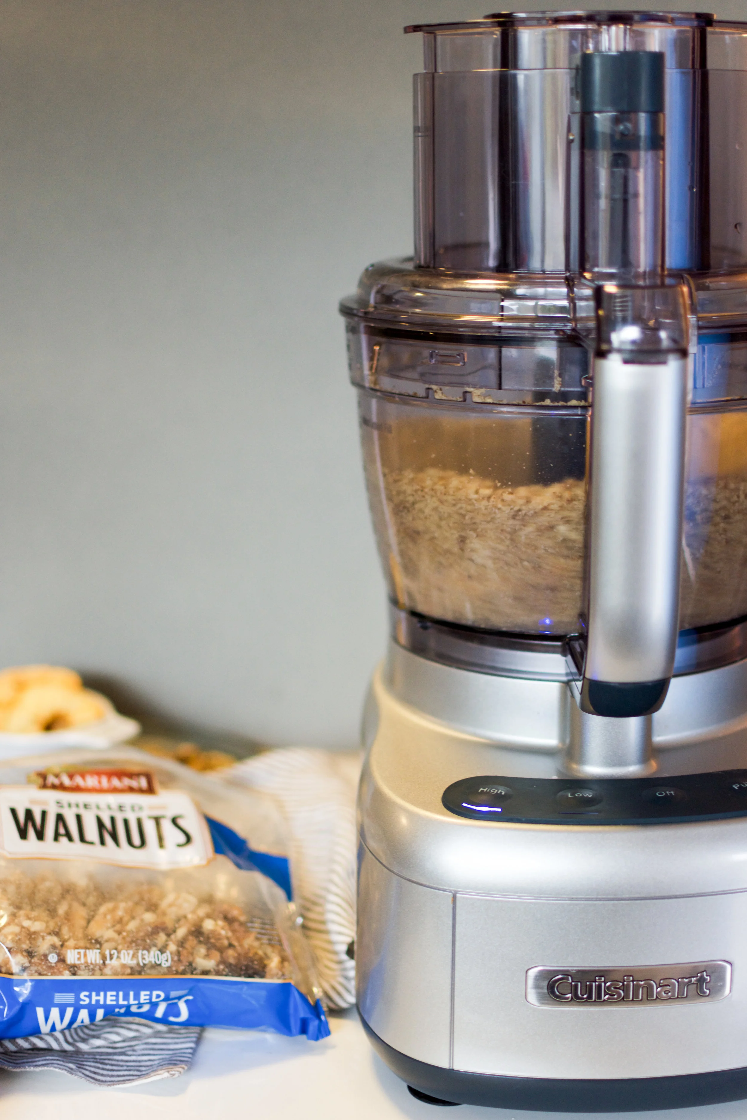 Pulse the walnuts and apples 5-6 times to chop, then process for 2-3 minutes until it looks like coarse flour.